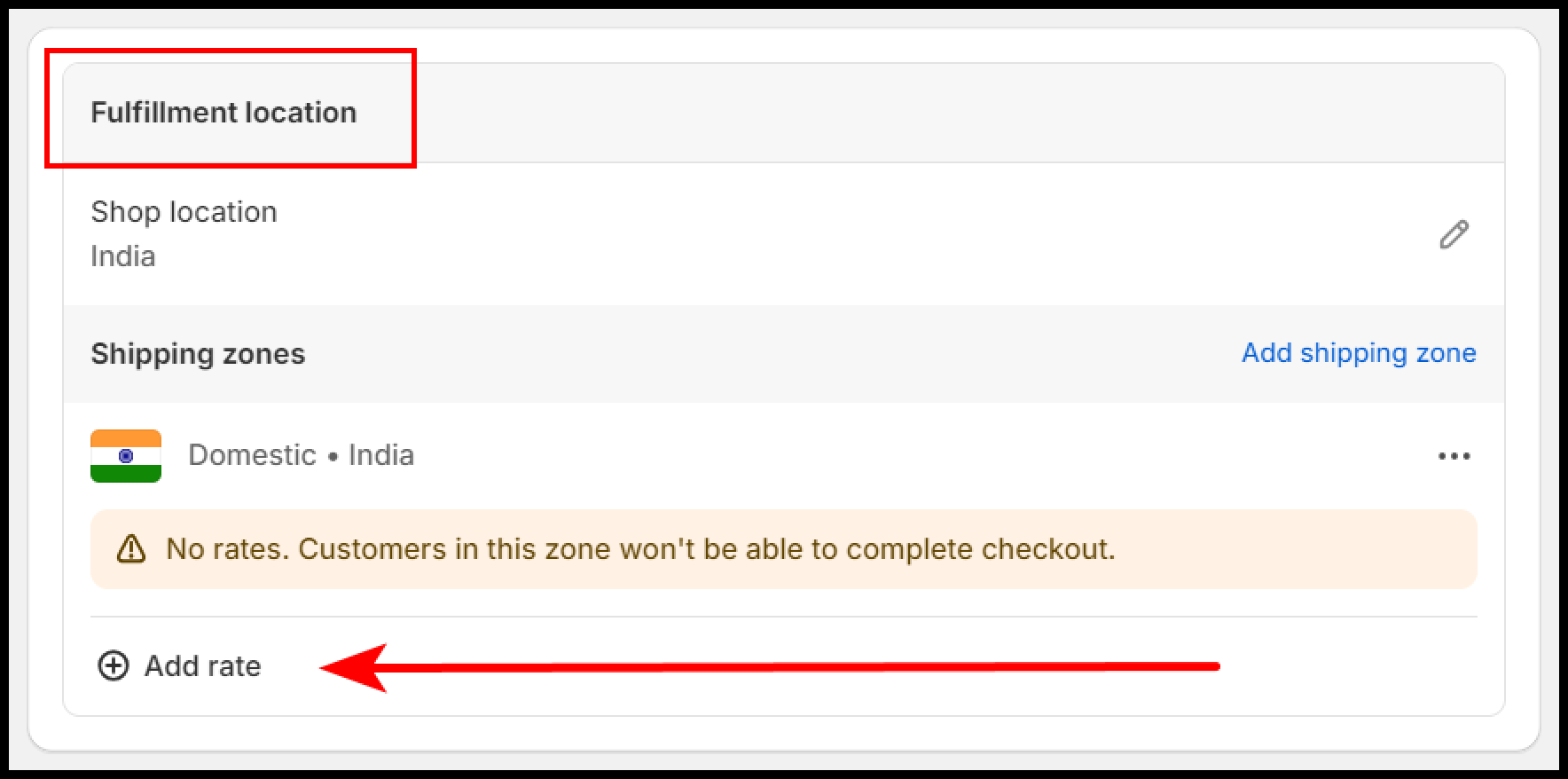 Scroll down to **Fulfillment location** and select the **+ Add rate** button.