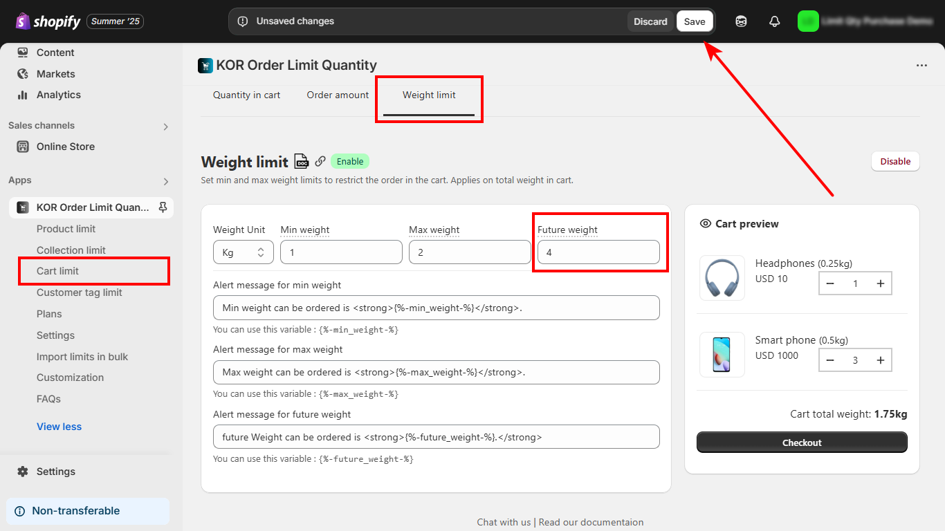Go to **Cart Limit** <mark style="color:blue;">➤</mark> **Weight Limits**.