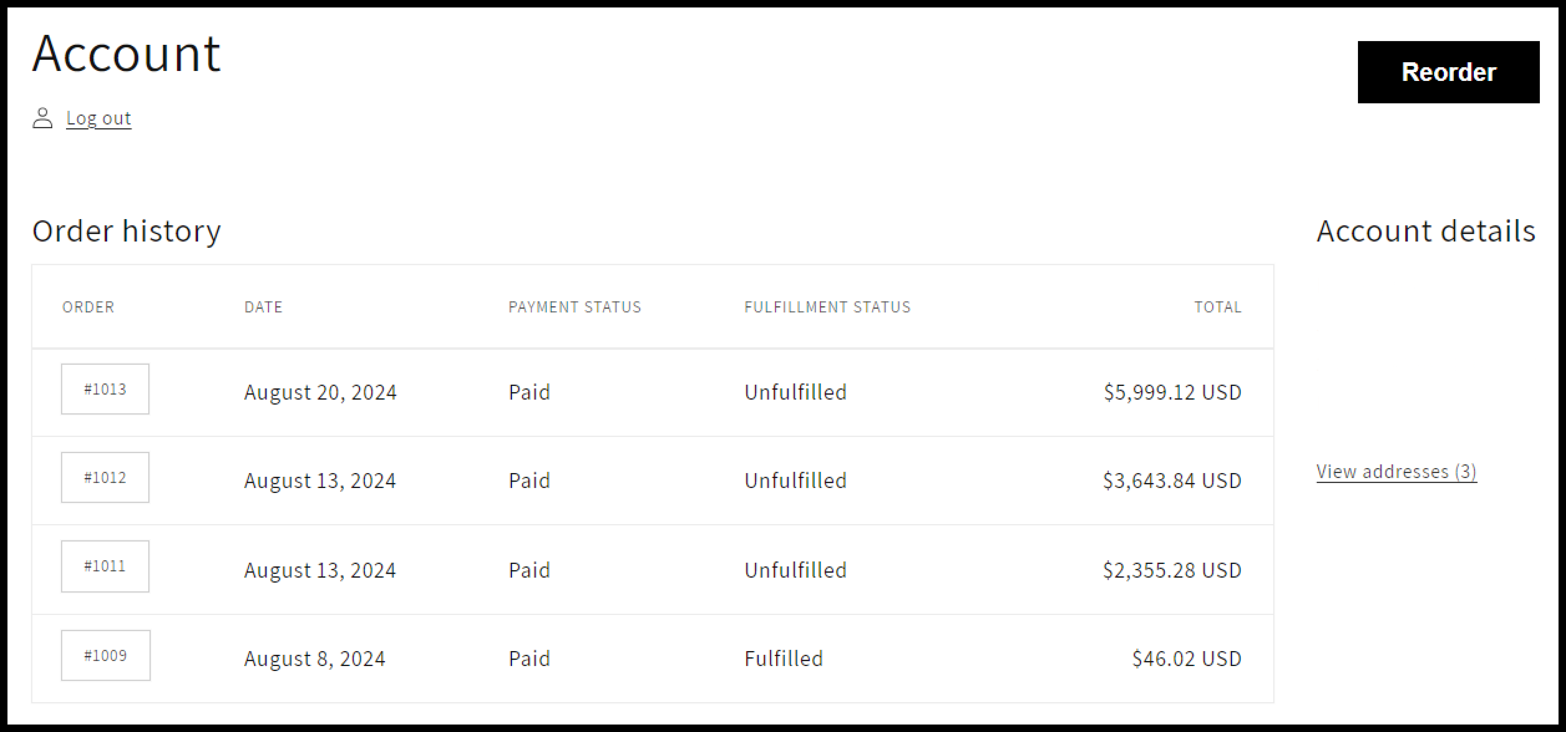 So when you add this reorder app block, a **Reorder** button will be added to the customers' account section from where the customers can easily repeat their previous orders with just one click.