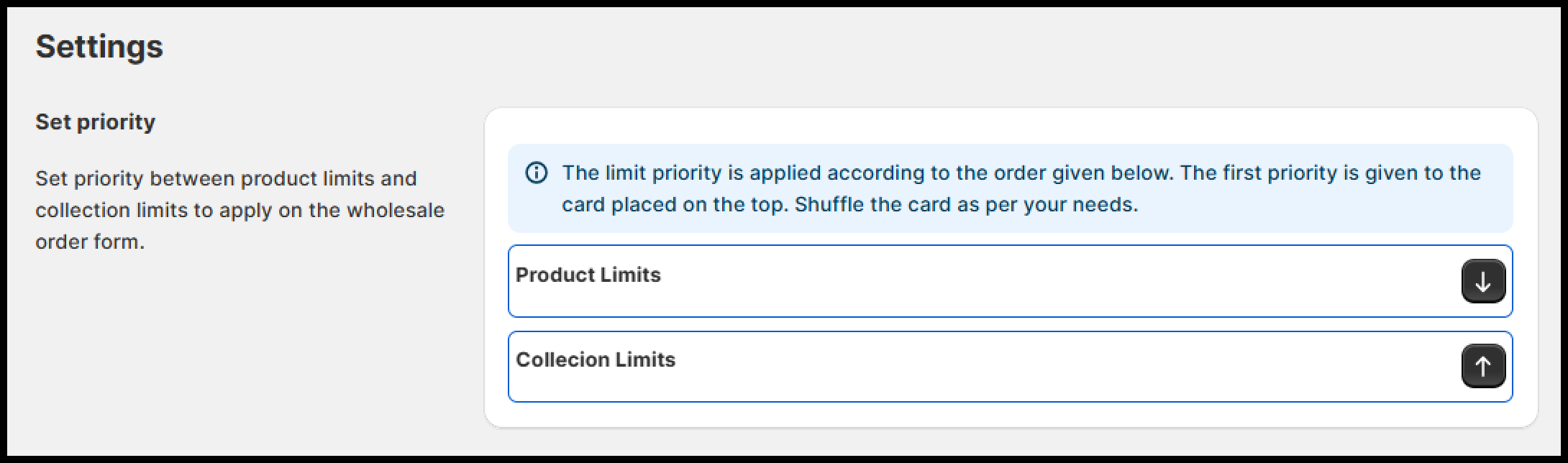 This Shopify app allows you to apply priority between collection limits and product limits on the wholesale order.