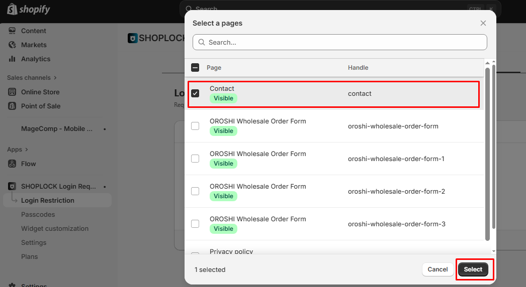 For instance, you have selected the  **Contact** page & click on the **Select** button.