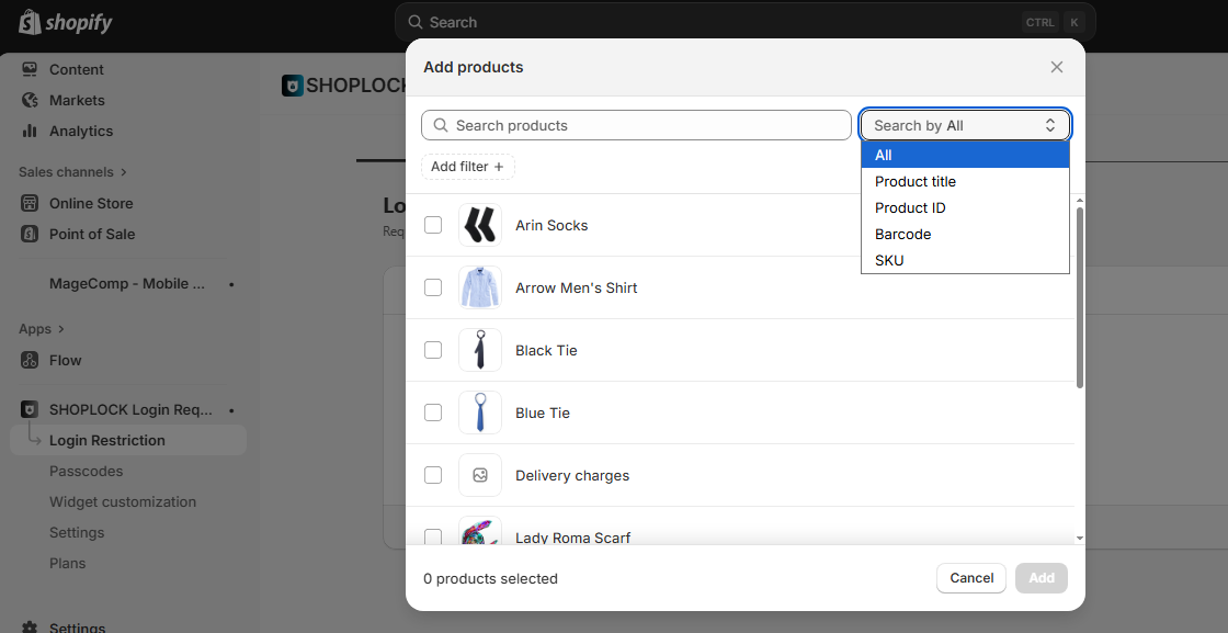 After that, search for the product name you want to restrict, or select the checkbox displayed before the product name & select the add button.