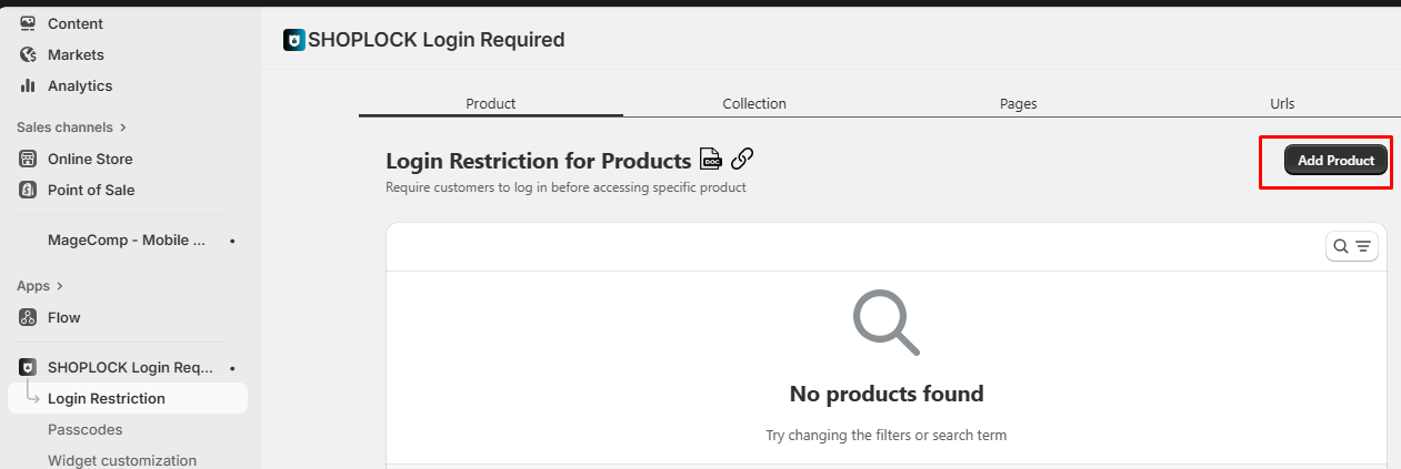 Navigate to the app's backend and go to the **Login Restriction** <mark style="color:blue;">➤</mark> **Product**  <mark style="color:blue;">➤</mark> **Add Product** button.