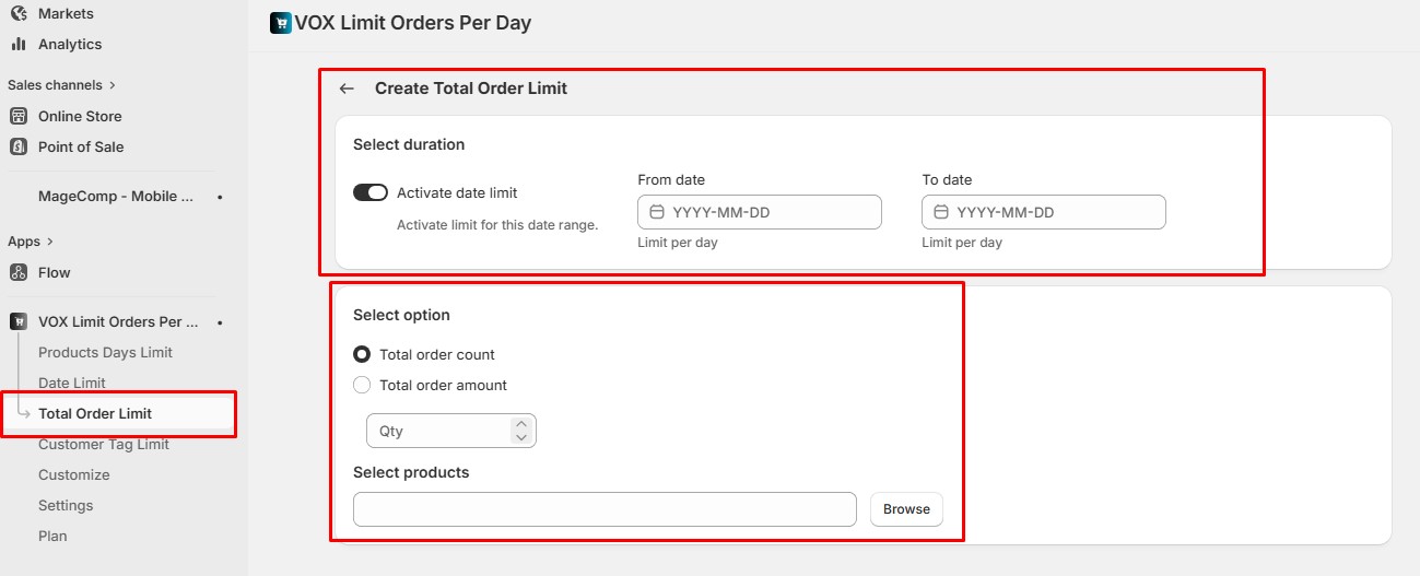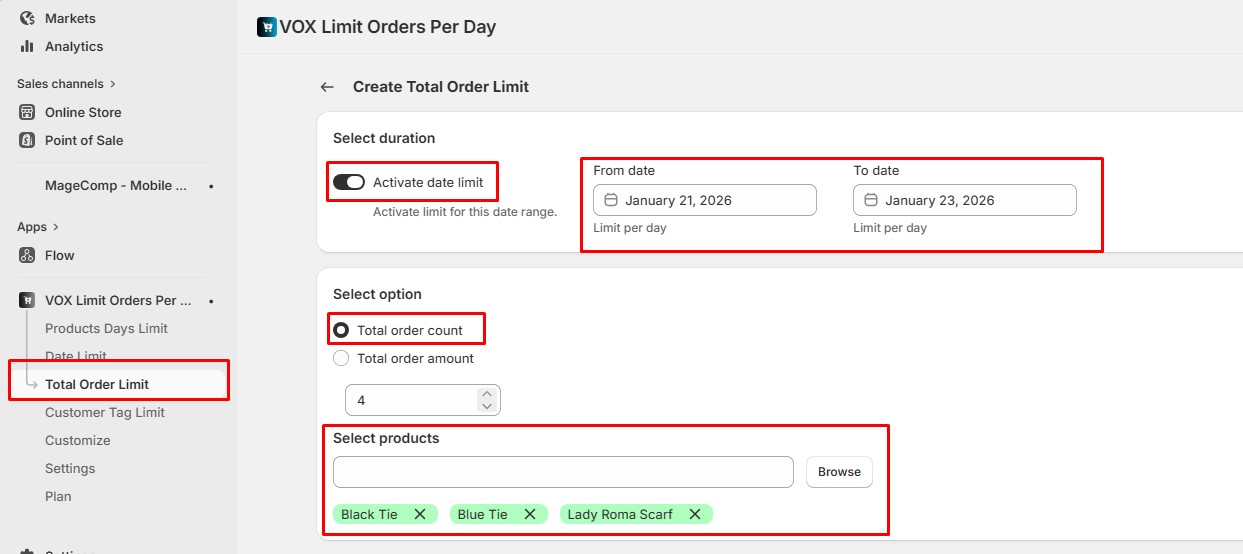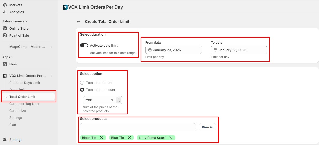 Now, if you want to set limits based on **order amount**, the **Total Order Amount** option allows you to define a maximum **combined purchase value** for the selected products within the specified date range.
