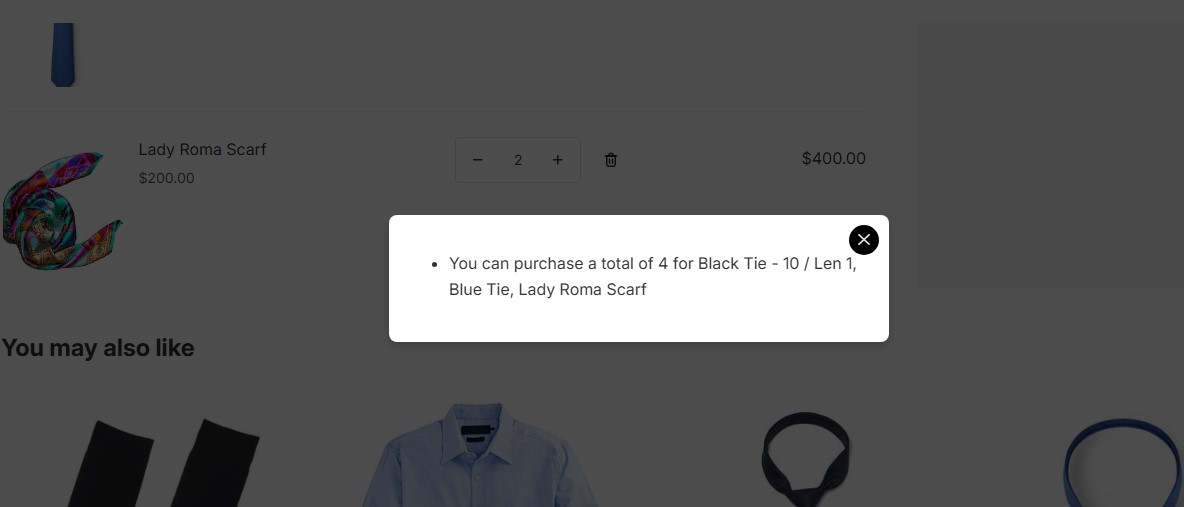 When multiple products are selected, the system calculates the **total price of all selected products in the cart**. Once the total order amount reaches the limit you set, customers will **not be able to add any more of the selected products** during the active date range.